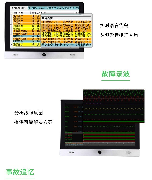 系統(tǒng)人機界面友好,以配電一次圖的形式直觀顯示配電線路的運行狀態(tài),實時監(jiān)測各回路電壓、電流、功率、功率因數(shù)、電能等電參數(shù)信息,動態(tài)監(jiān)視各配電回路斷路器、隔離開關、地刀等合、分狀態(tài),以及有關故障、告警等信號。