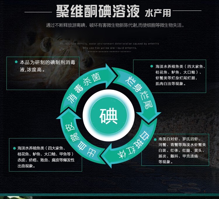水產(chǎn)用聚維酮碘的作用廣泛的用于水生動(dòng)物的殺菌與消毒,可以幫助水生動(dòng)物預(yù)防各種疾病,是一種非常好的水產(chǎn)用品。