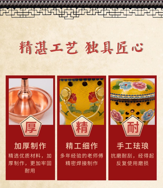 關(guān)鍵詞 | 琺瑯小火鍋,琺瑯銅火鍋,燃油小火鍋,景泰藍(lán)火鍋 |
